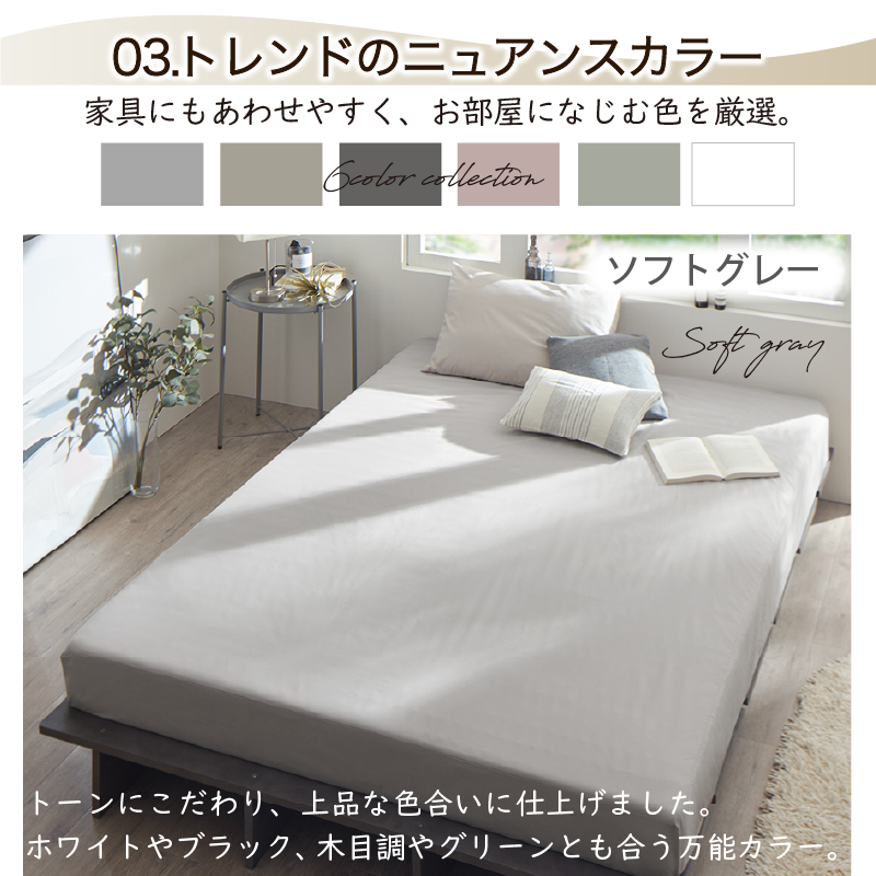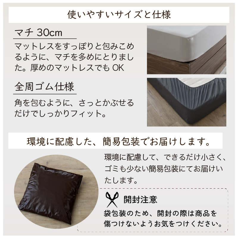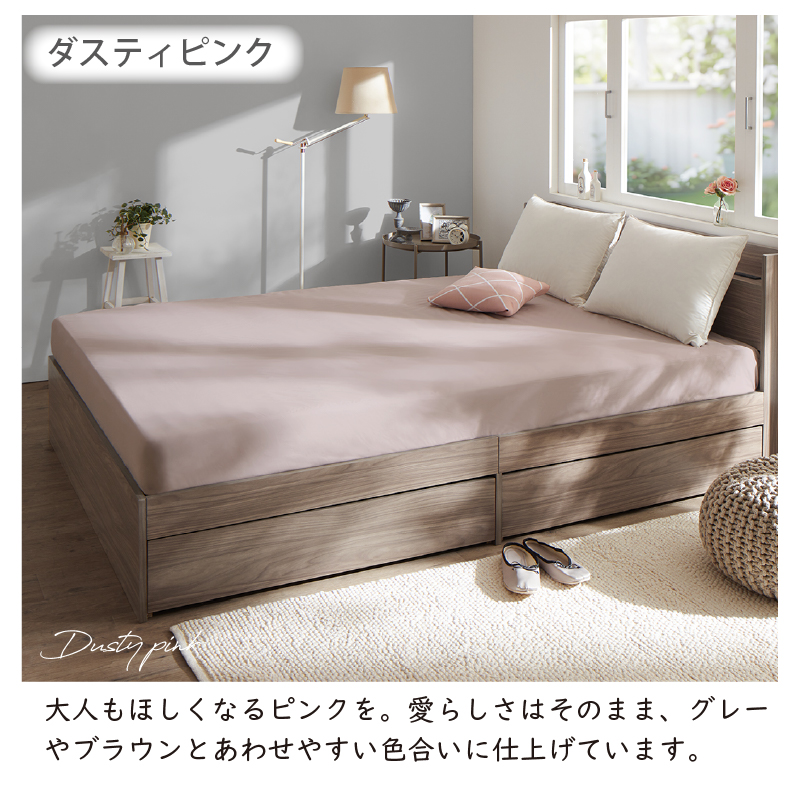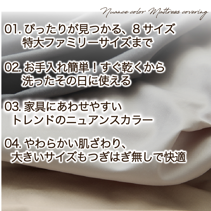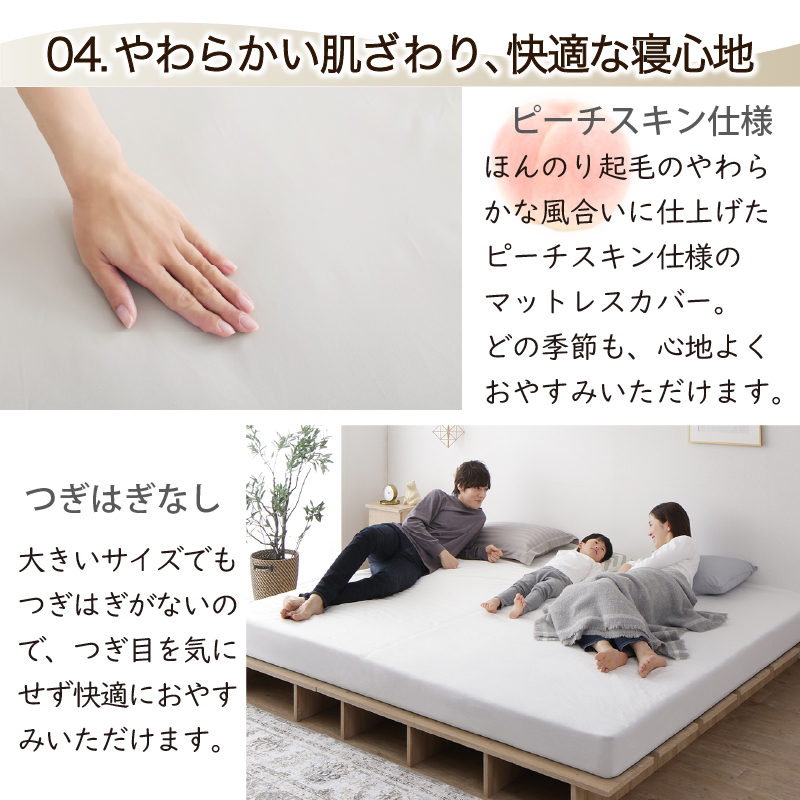ほんのり起毛のやわらかな風合いに仕上げたピーチスキン仕様のマットレスカバー。