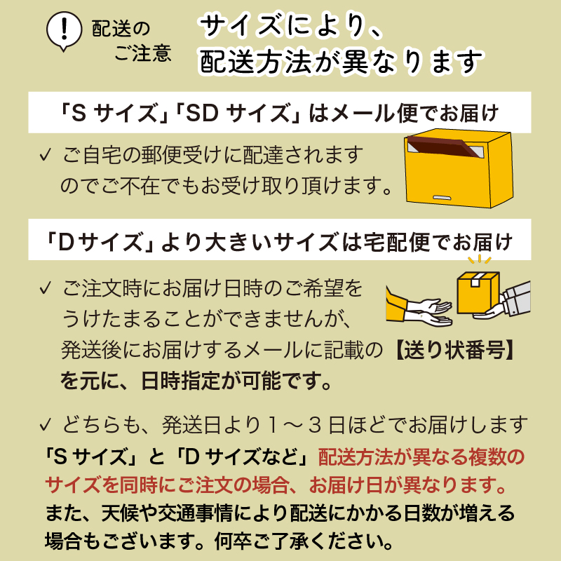 「Sサイズ」と「Dサイズなど」配送方法が異なる複数のサイズを同時にご注文の場合、お届け日が異なります。