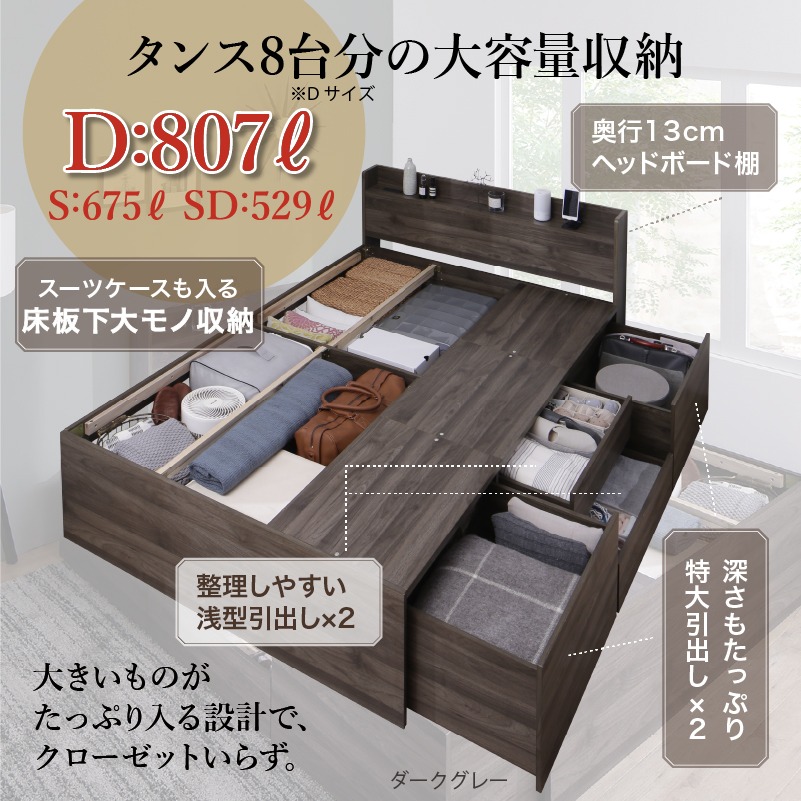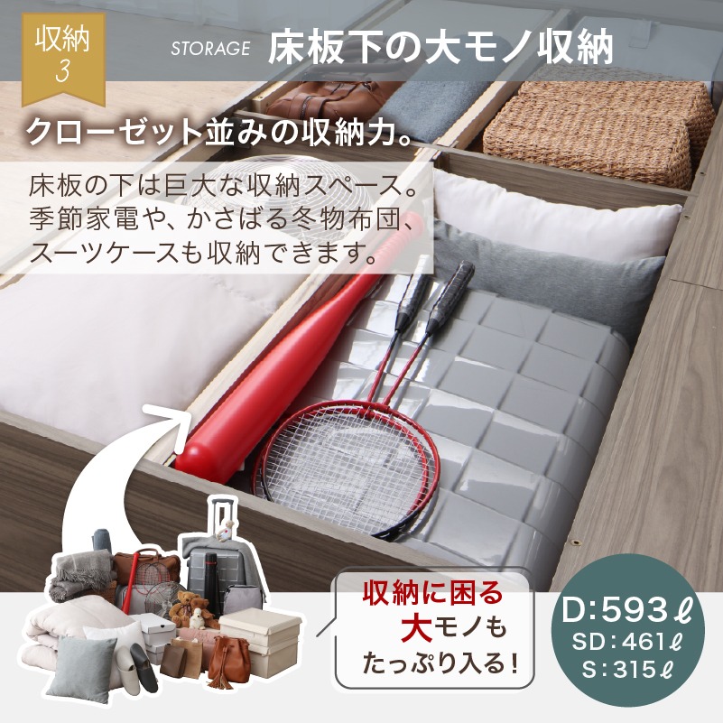 ベッドの内部空間には最大で引き出し約30杯分のの巨大な収納スペース。※Dサイズの場合